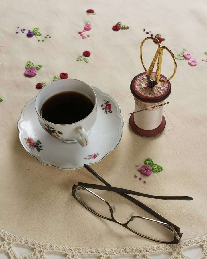But then looking for something else in the second-hand store, I stumbled upon a tiny tablecloth with a close colour and a little embroidery that I thought would work.