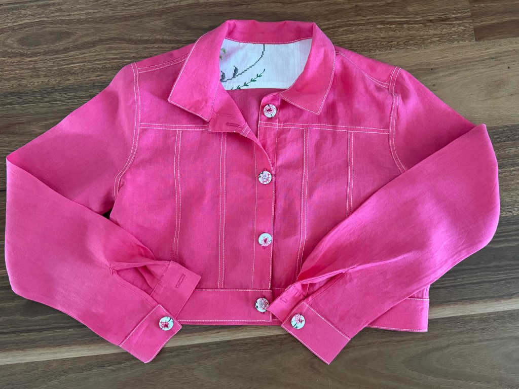 I paired the dress with a cute little crop Smitten jacket from @patternemporium_kate using the leftover contrast linen fabric from my 2024 Perth Frocktails dress and had enough scraps amongst the tablecloths to cover the buttons in embroidery & line the yoke.’