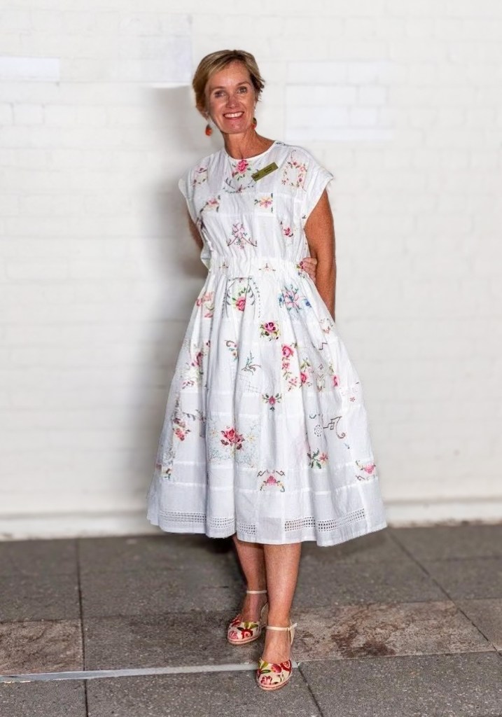 From the 6 tablecloths I cut 172!! pattern pieces – ordinarily the multiple identical pieces can be cut in bulk – however I couldn’t do this without compromising the placement of the embroidery – many hours of planning, pinning & checking before I started to cut. Quilters will be familiar with fussy-cutting and there was certainly lots of that. The construction & sewing of the dress isn’t difficult, & I enjoyed the slow sew & watching my vision come to life.