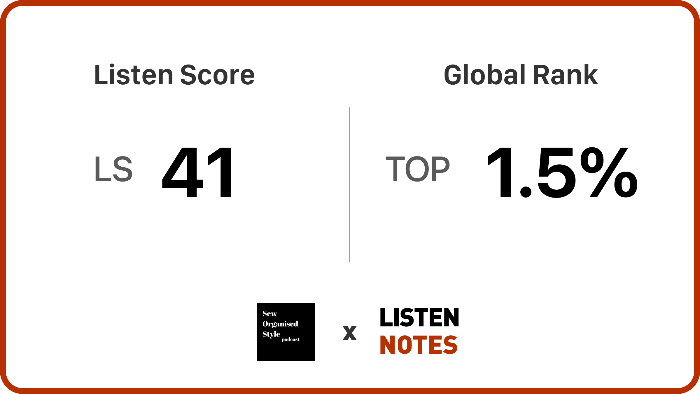 Sew Organised Style podcast is one of the top 1.5% most popular shows out of 2,726,760 podcasts globally, ranked by 41 Listen Score (the estimated popularity score). These stats were provided by Listen Notes. Make sure you read our Listen Notes interview.