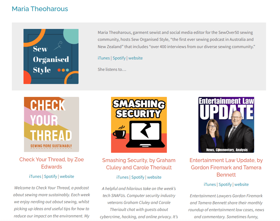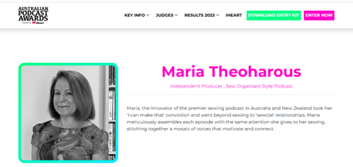 In 2024, Maria is judging the British Podcast Awards. ‘Maria, the innovator of the premier sewing podcast in Australia and New Zealand took her ‘I can make that’ conviction and went beyond sewing to ‘sewcial’ relationships. Maria meticulously assembles each episode with the same attention she gives to her sewing, stitching together a mosaic of voices that motivate and connect.’